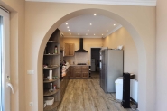 A földszinti konyha berendezési tárgyai: Ariston Hotpoint gáz főzőlap, Cata szagelszívó, Bosch sütő, mosogatógép. A mosogató gránitból készült. A képen, a földszinti konyha látható.